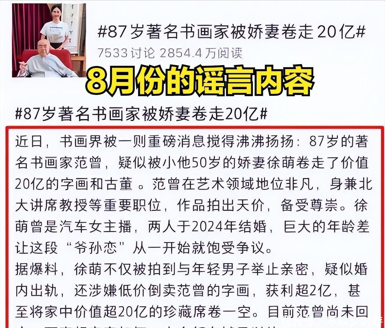今年8月中旬,“范曾遭小妻卷走20亿财产”的消息迅速席卷全网。彼时各类传言层出不穷:“徐萌实为继子介绍给范曾相识”、“徐萌设局软禁老人”、“大量名画被秘密转移出境”。很快,范曾唯一的亲生女儿范晓蕙便在社交平台发声,称父亲已“失联多日”,并指控徐萌擅自清空家中多年积累的艺术珍藏。