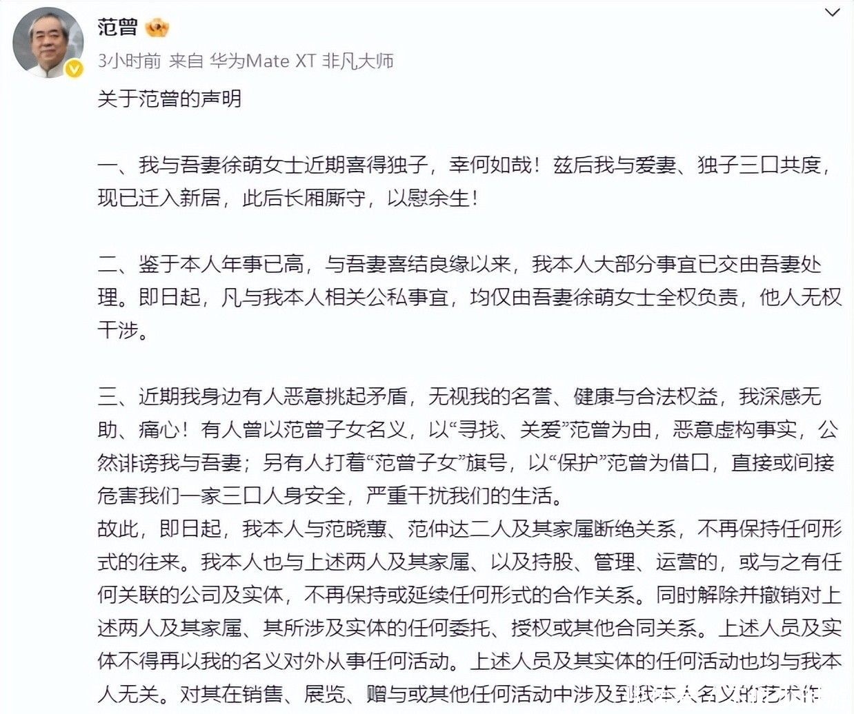 2. 新民晚报:87岁书画大师范曾声明:近期“喜得独子”,即日起与女儿、继子断绝关系