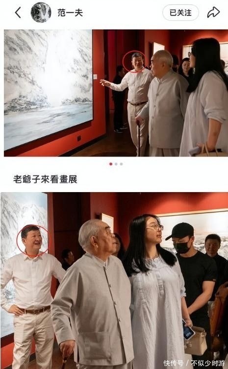 更引人注目的是,在范晓蕙发文仅数日后,范曾的继子范一夫便在社交媒体晒出老爷子参观画展的照片,直接粉碎了“父亲失联”的说法。照片中徐萌安静立于范曾身旁,面容素净、衣着宽大,身形略显丰腴,不少网友纷纷留言调侃:“这状态,怕是怀上了吧?”