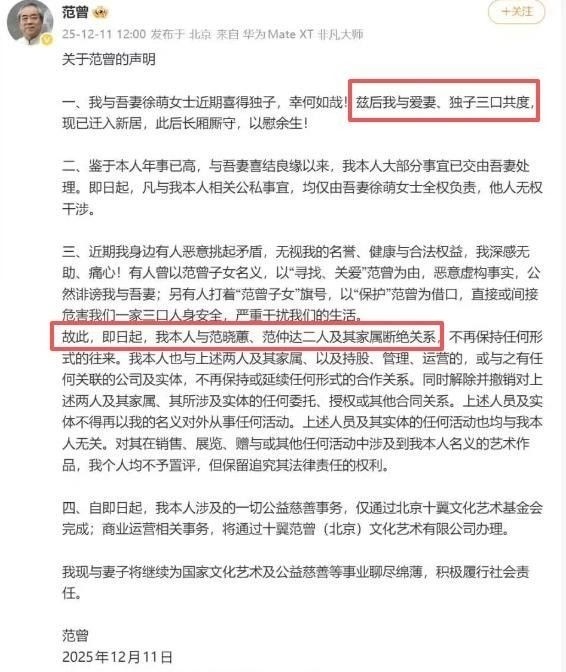 正因如此,范曾在文末郑重宣告:自即日起,与继子范仲达、亲女范晓蕙及其相关亲属断绝一切往来,不再有任何形式的联系。从“被劫持失踪”到“老来得子”,从“子女维权”到“亲情决裂”,短短数月之间剧情几经反转,令人唏嘘不已。